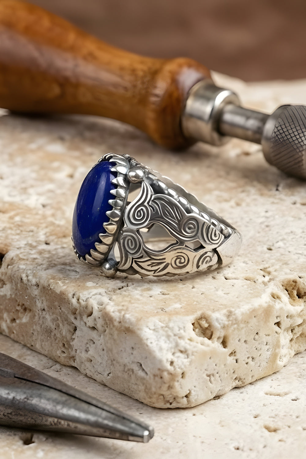 Crafted from Lapis stone and 925 sterling silver, this handmade ring highlights the deep blue tones and natural flecks of the stone. Lapis has been valued for centuries for its connection to wisdom and strength. A perfect statement piece for men who appreciate timeless design and authentic craftsmanship.