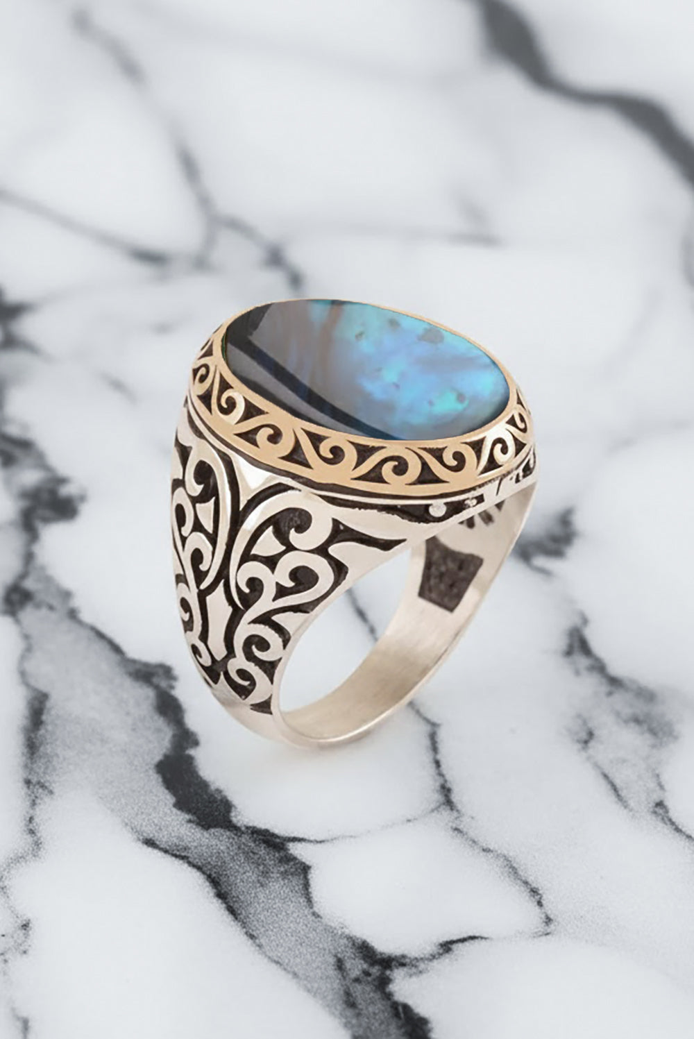 Discover the iridescent beauty of genuine Mother of Pearl. This ring, crafted in polished 925 sterling silver, reflects light with a natural shimmer. An elegant choice for those who love ocean-inspired aesthetics.